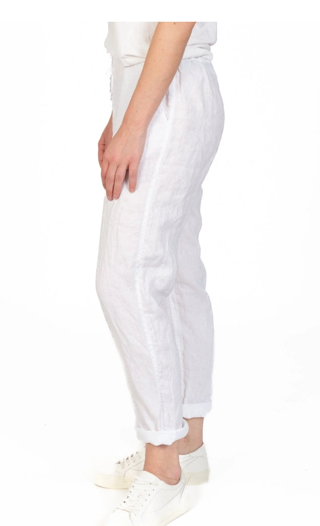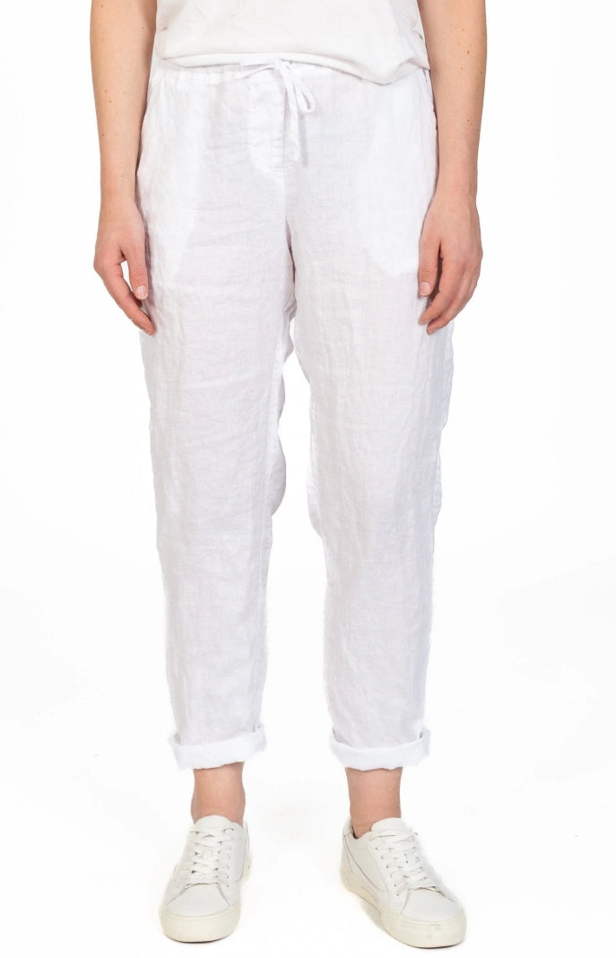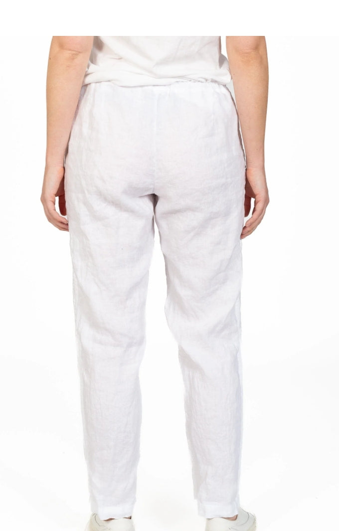 Tapered leg pant with a regular rise and a narrow elastic waistband