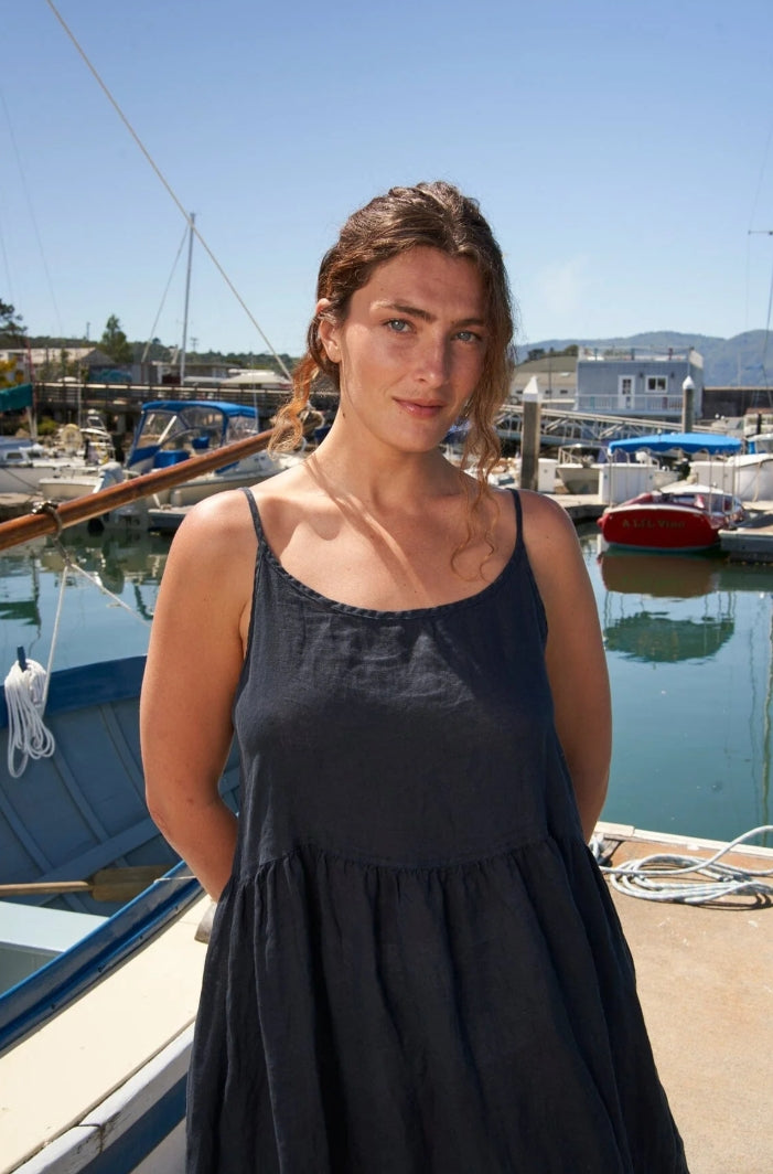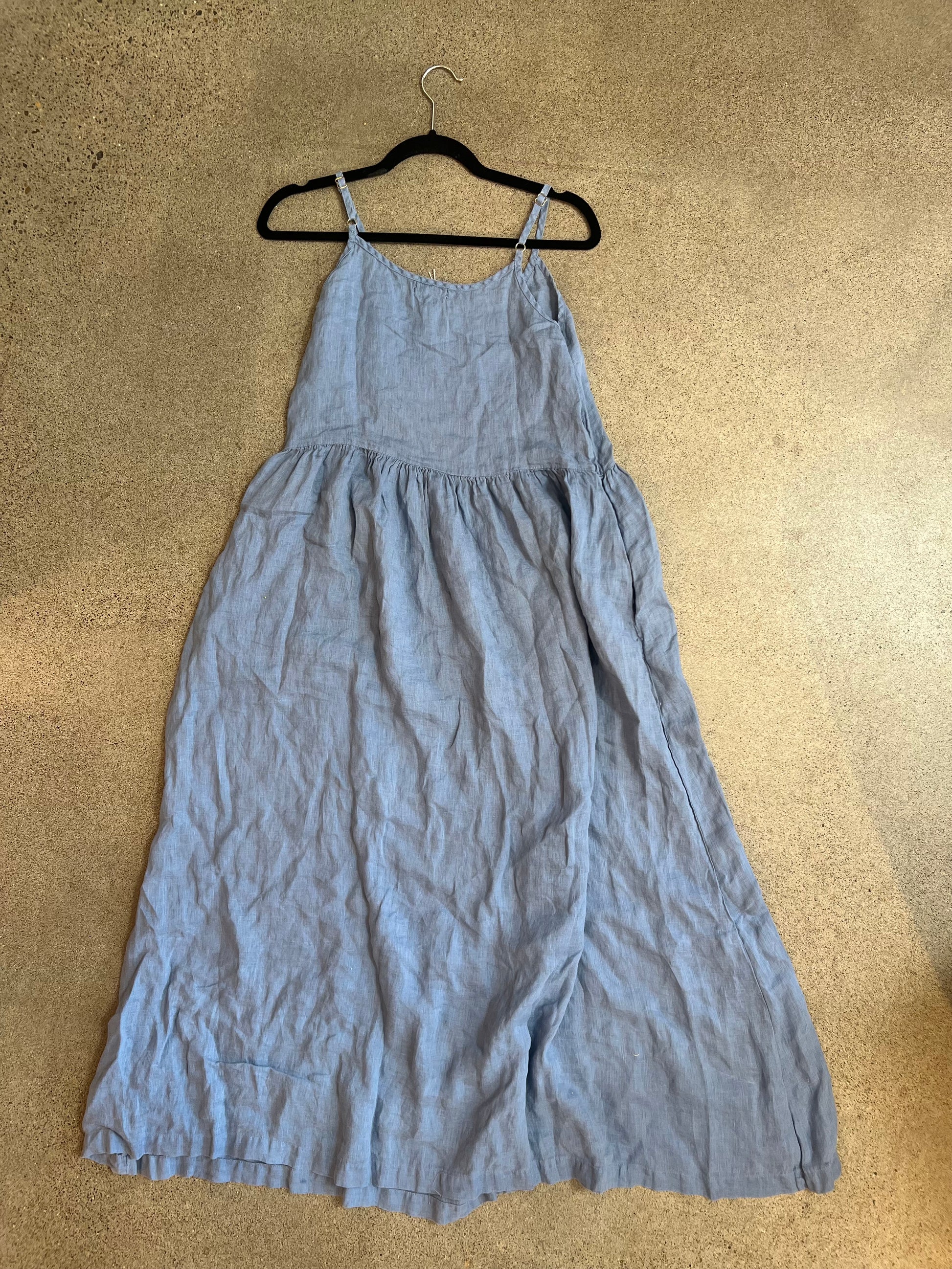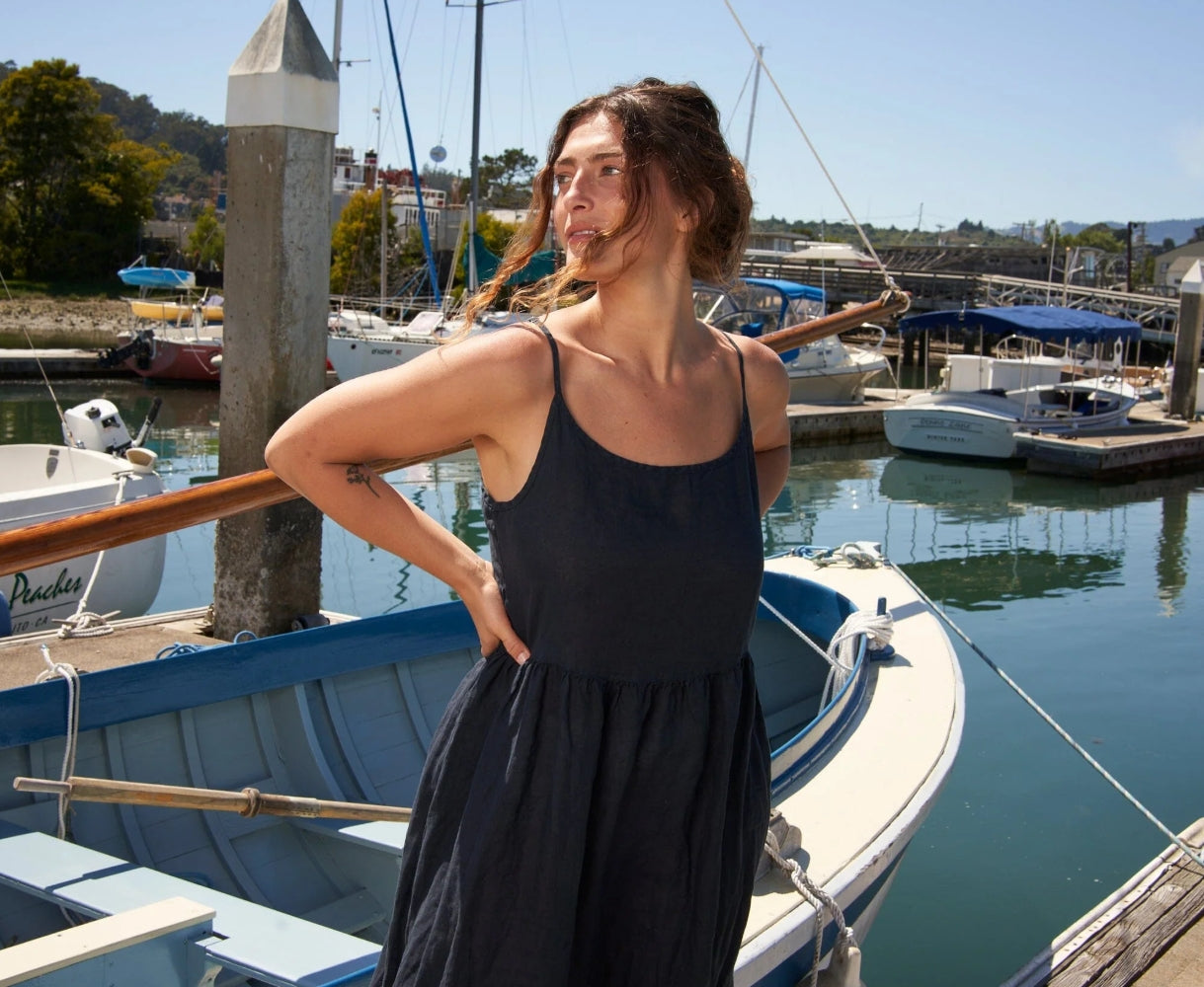 Maxi length dress with adjustable straps, pockets, and a high waist