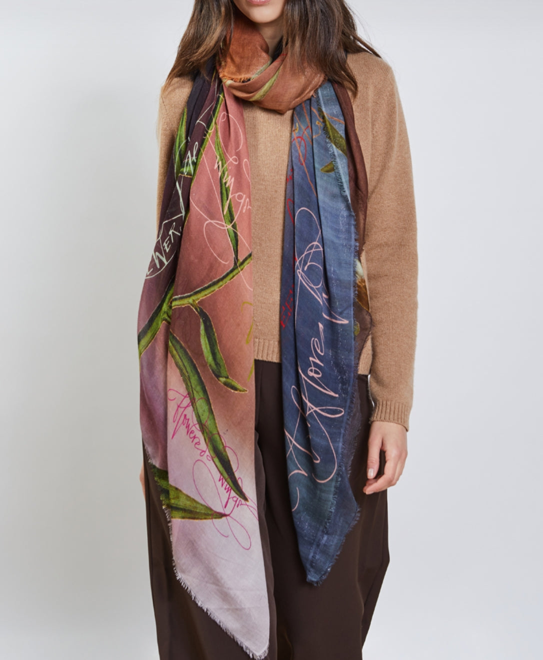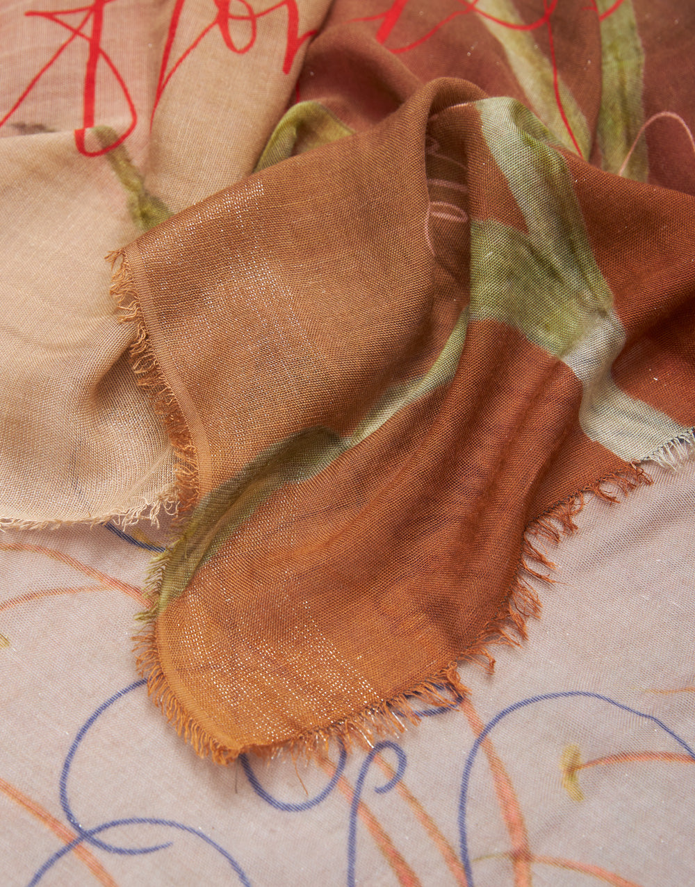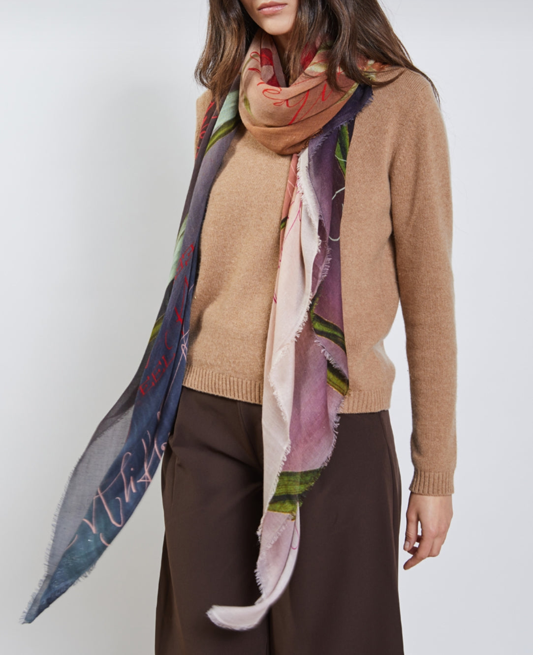 This scarf is in collaboration with Betty Soldi: a visual and visionary design studio that works with words, flowers and images. Born from the creative thought of the Renaissance, artistic calligraphic drawings are poetically full of depth of meaning, inviting curious souls to travel through vivid landscapes of an imaginary world. - FS