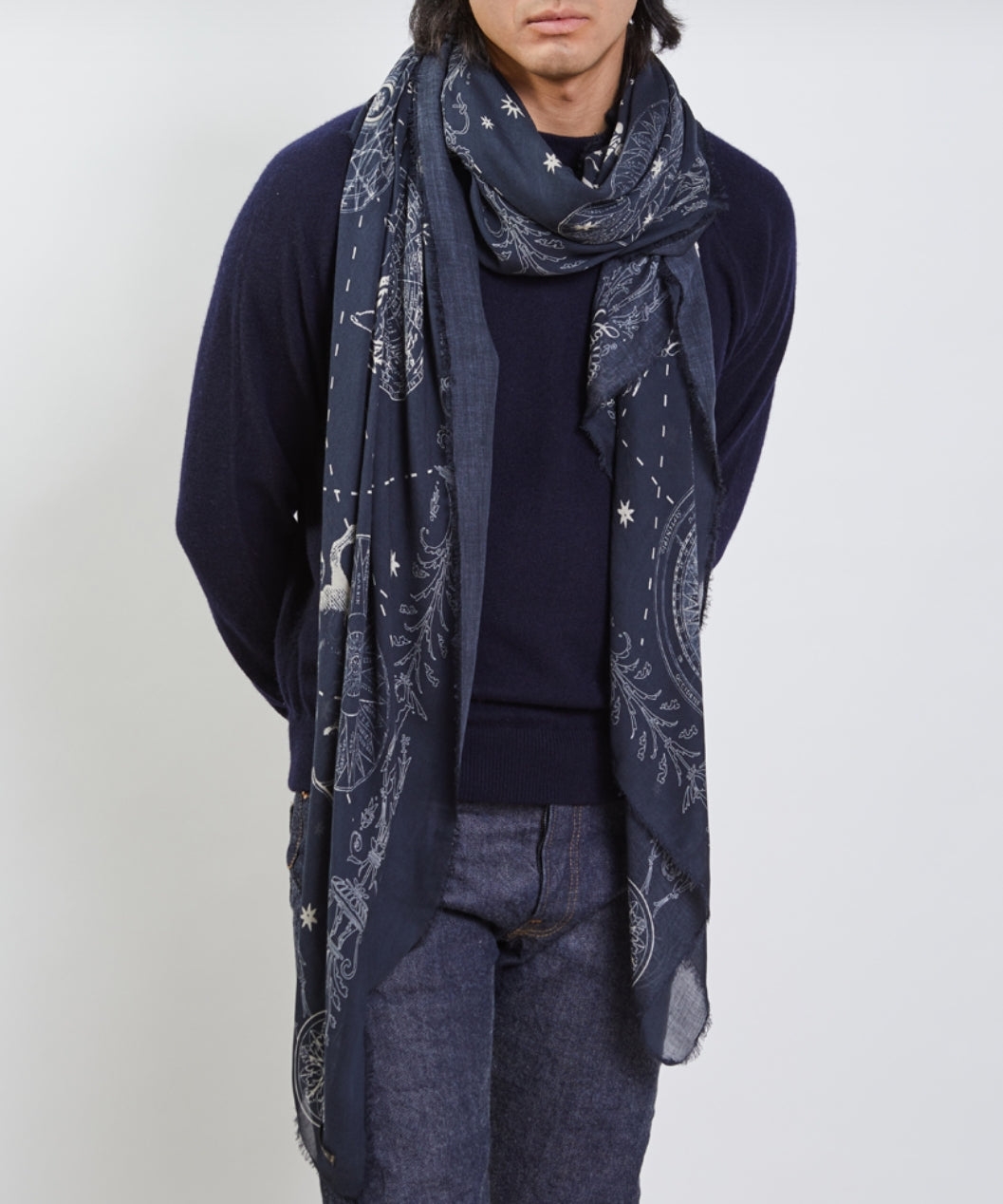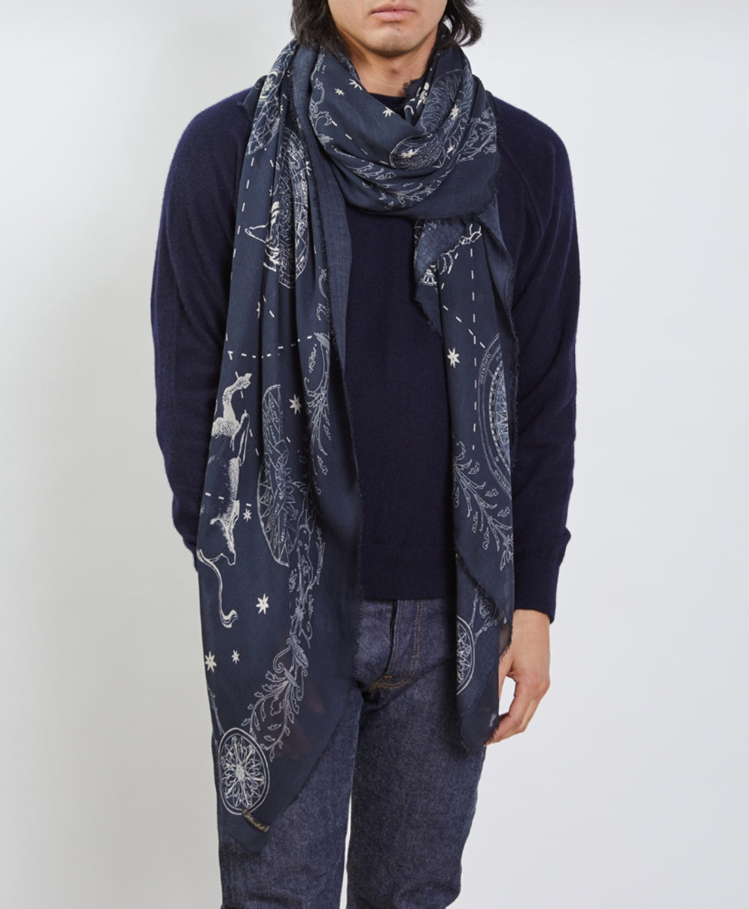 The astrology scarf presents a print with the zodiacs signs woven in modal and cashmere fibers. An intense blue evokes the depth of the sky and infinity. -FS
