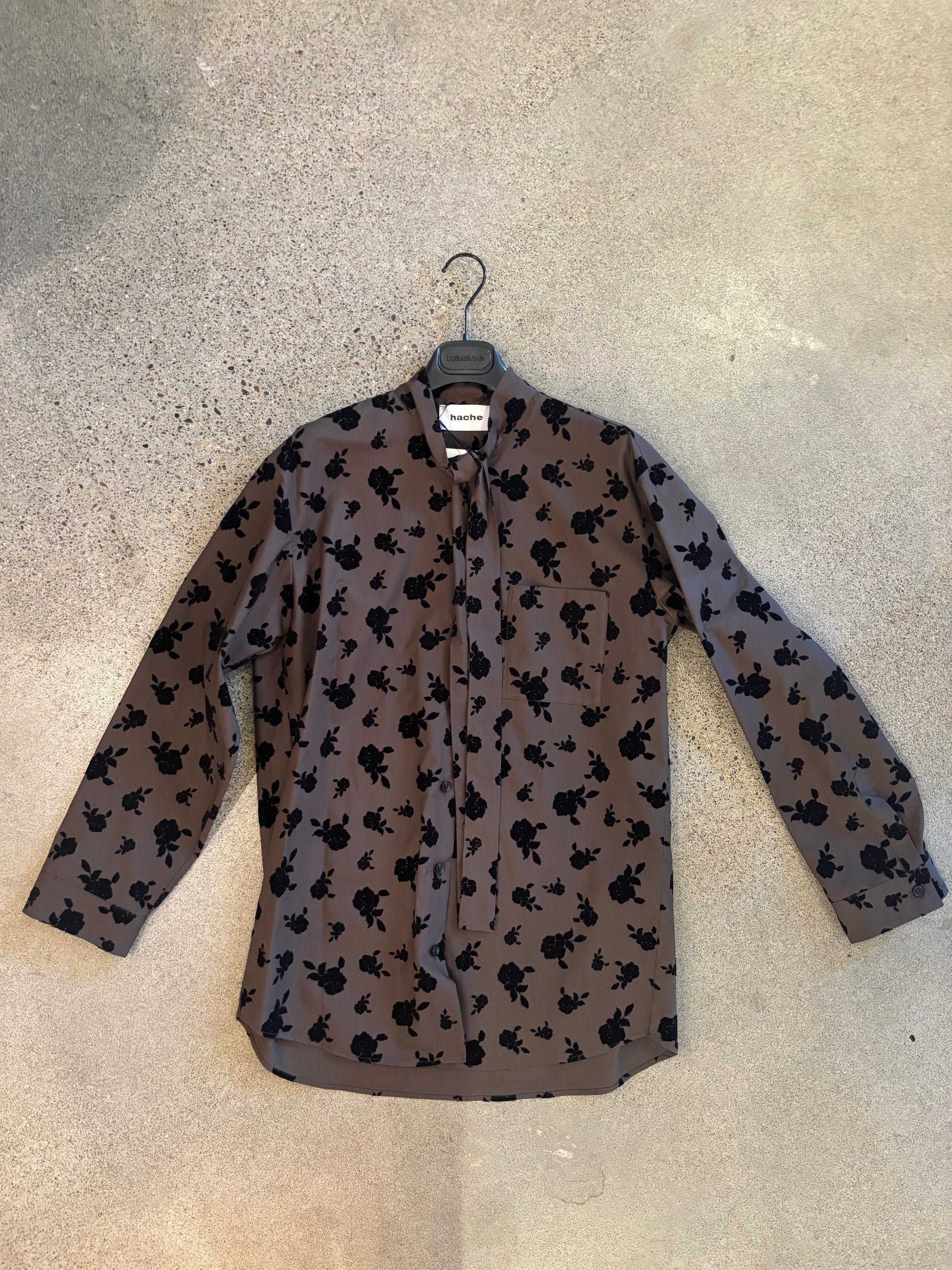 Cotton button-up shirt with a tie collar and a velvety flower pattern