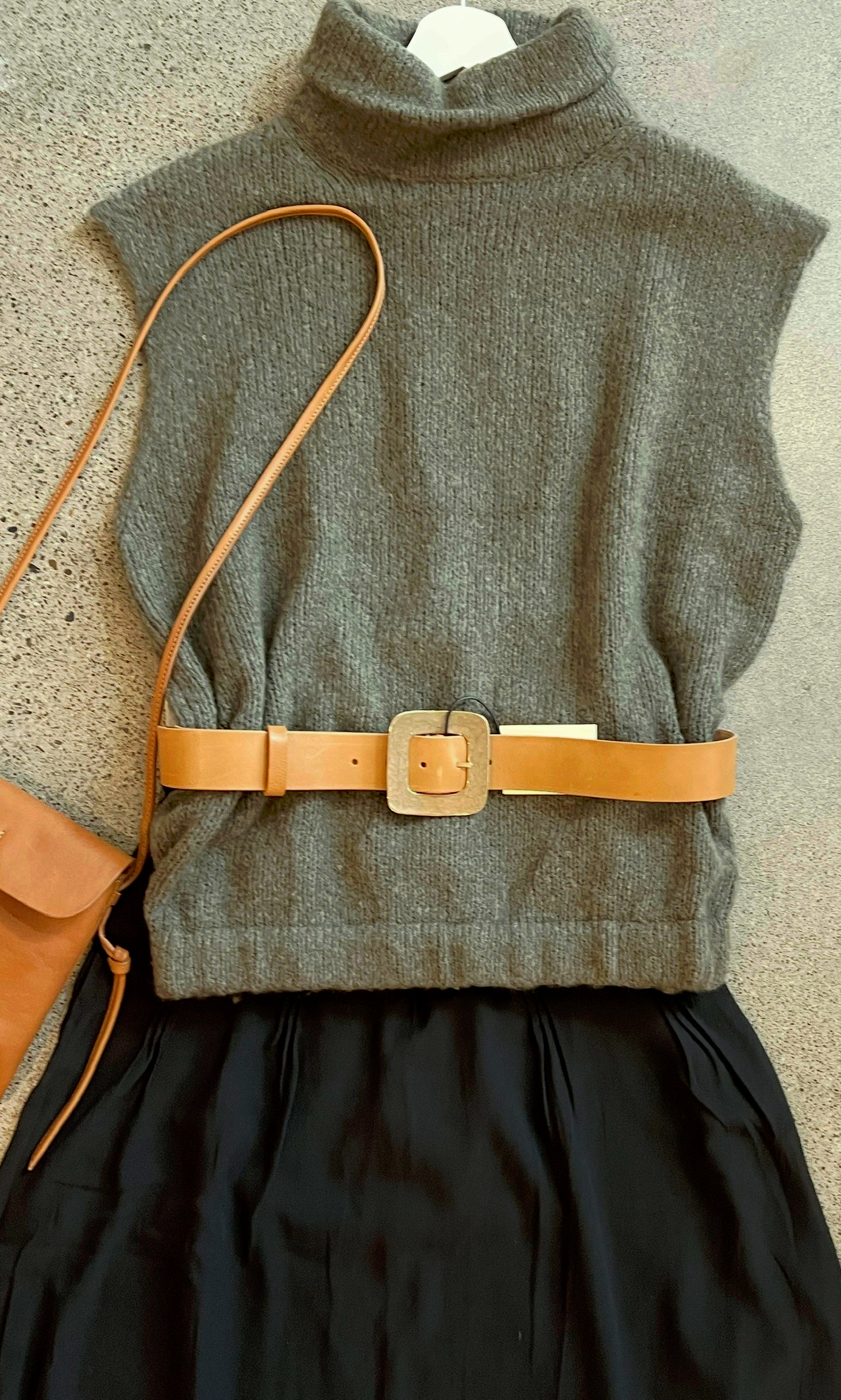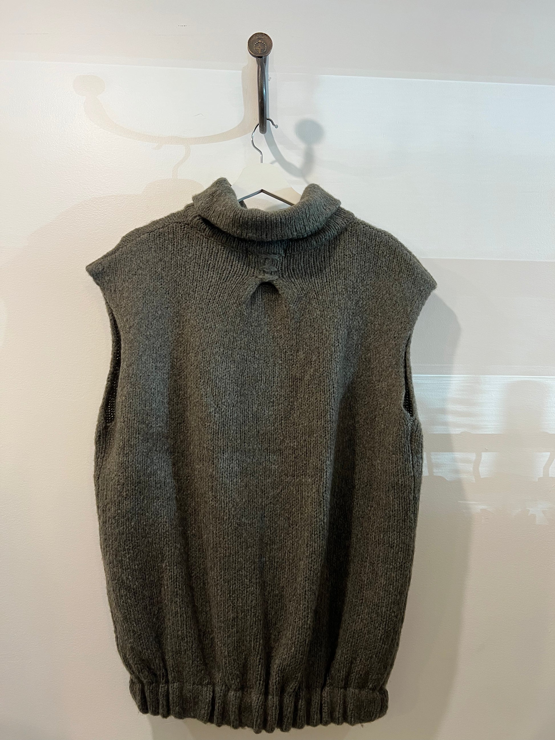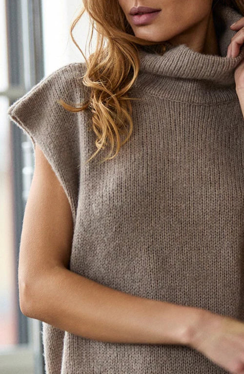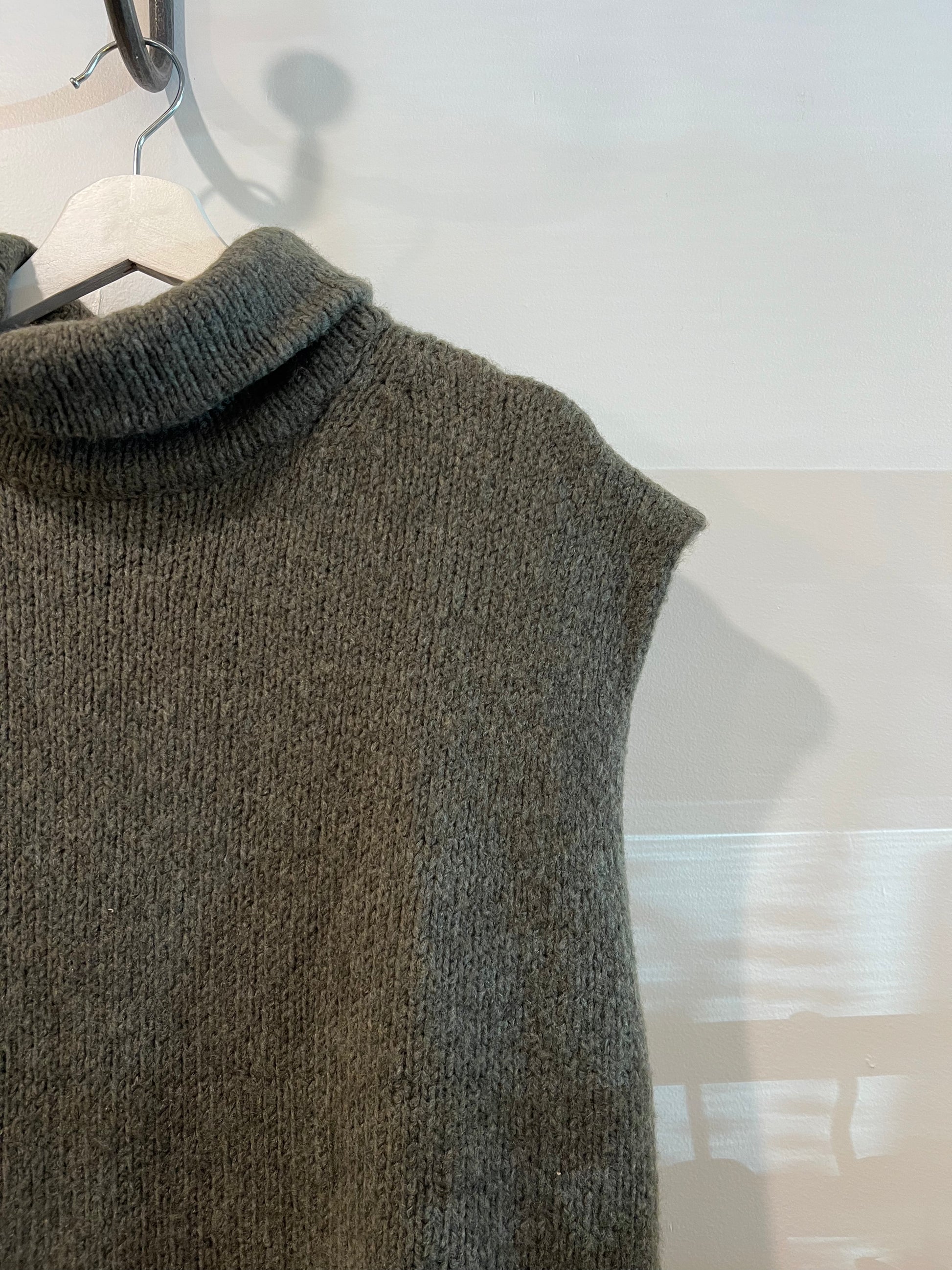Chunky sleeveless knit in a soft cashmere-wool blend with a relaxed turtleneck collar. Perfect for layering!