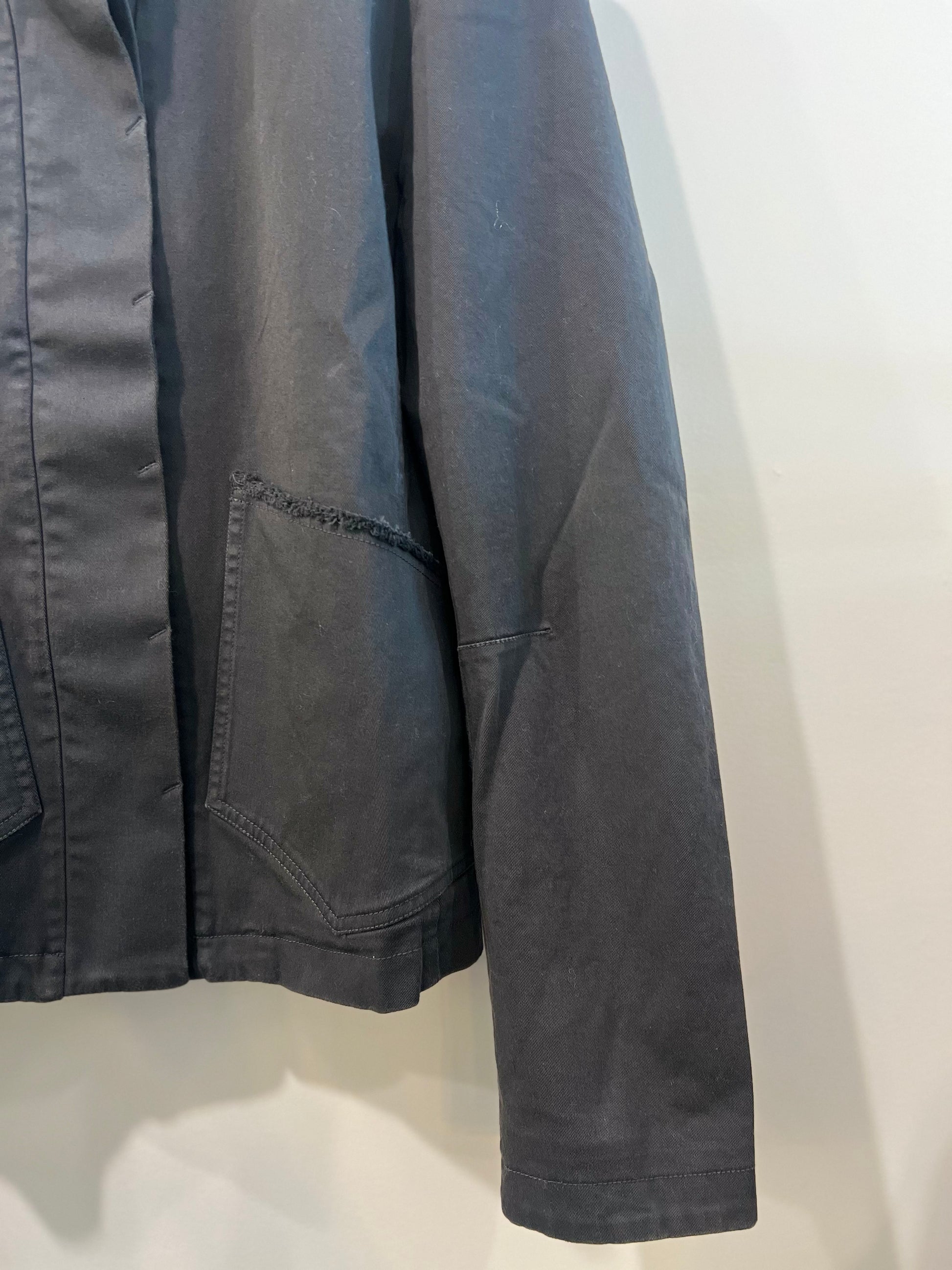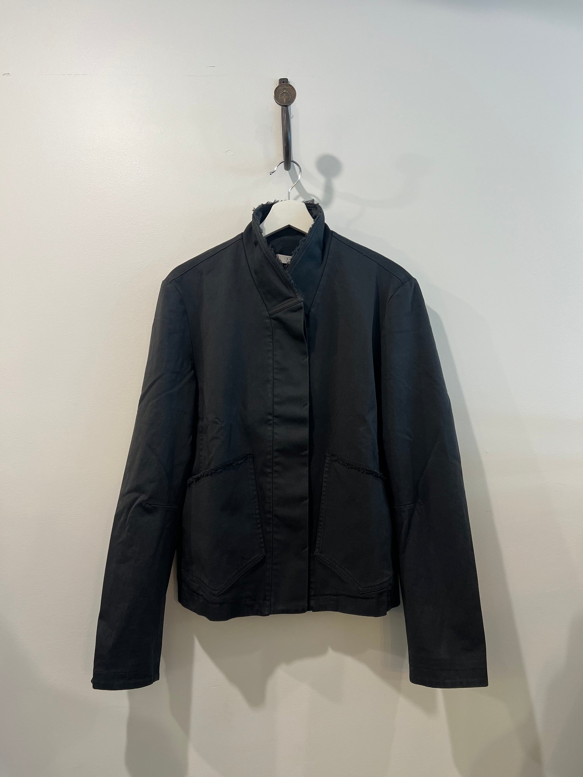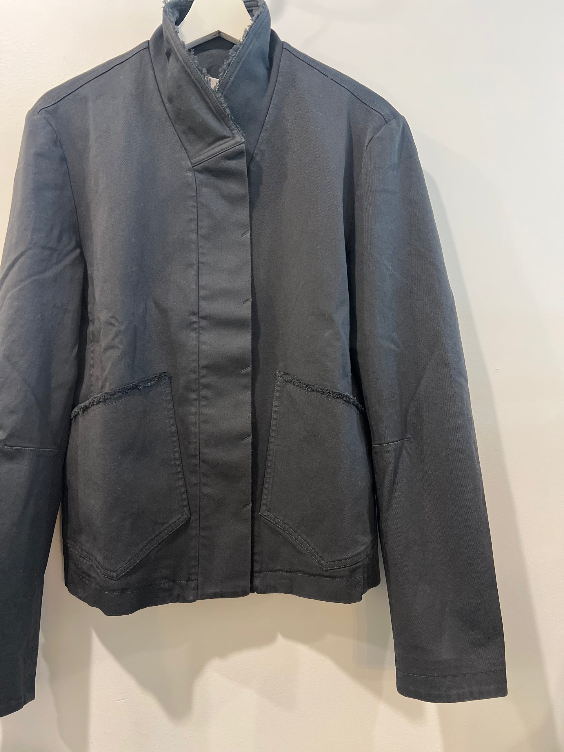 Raw-edge detailing along pockets and collar