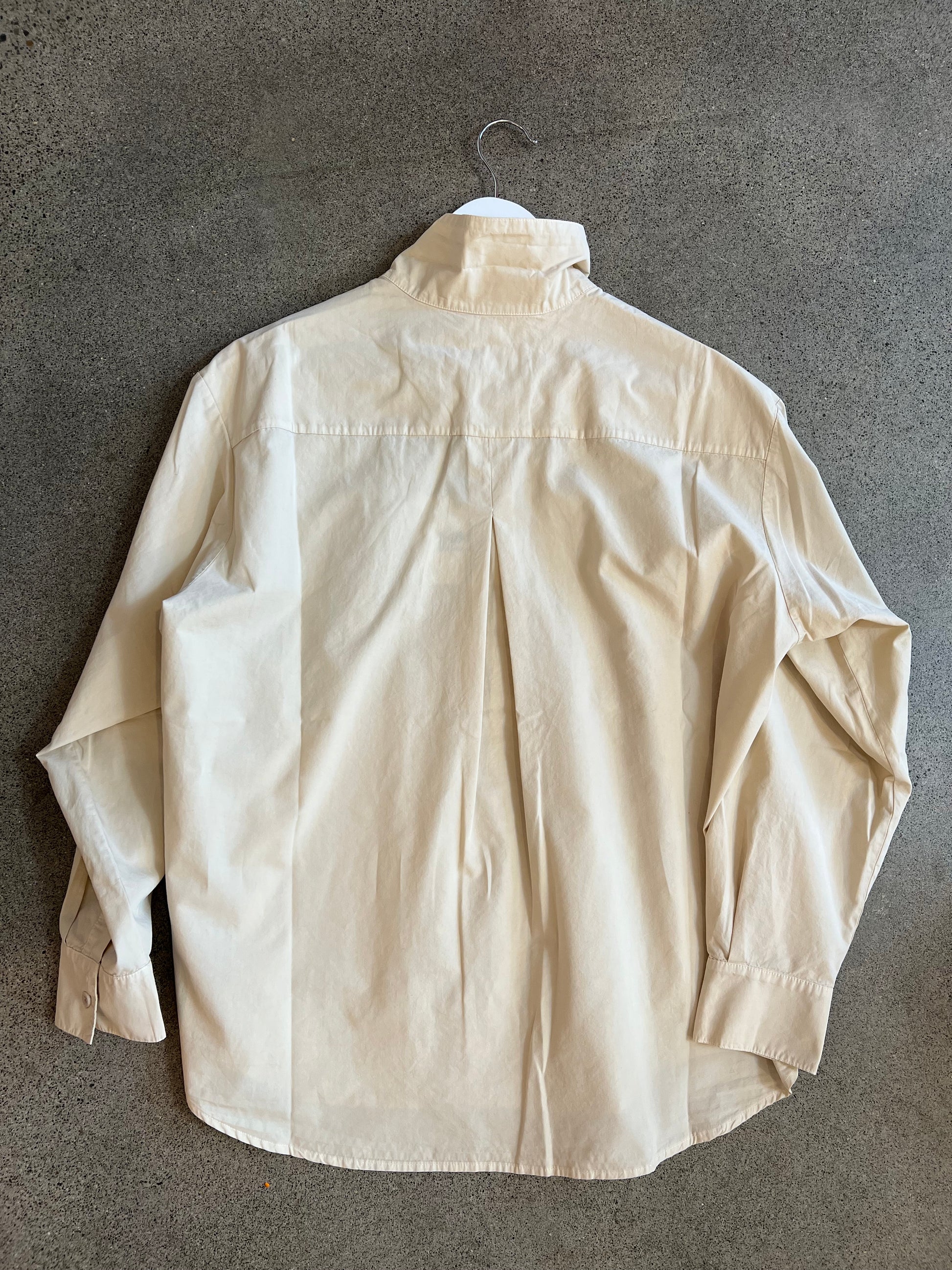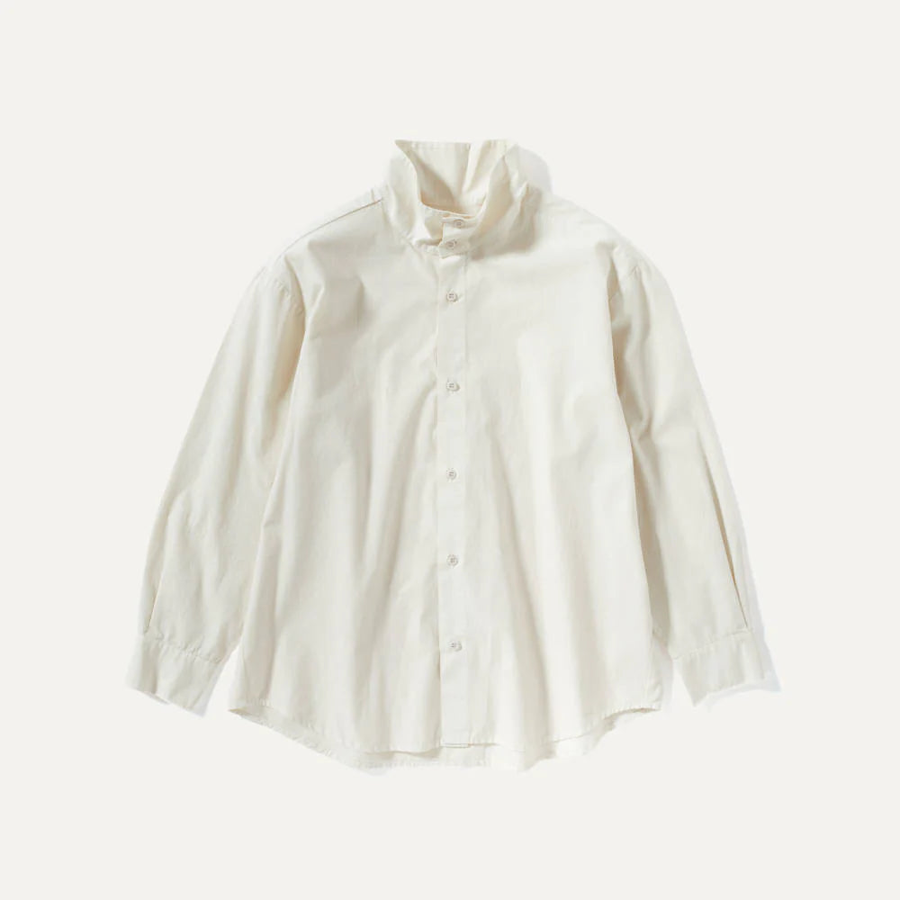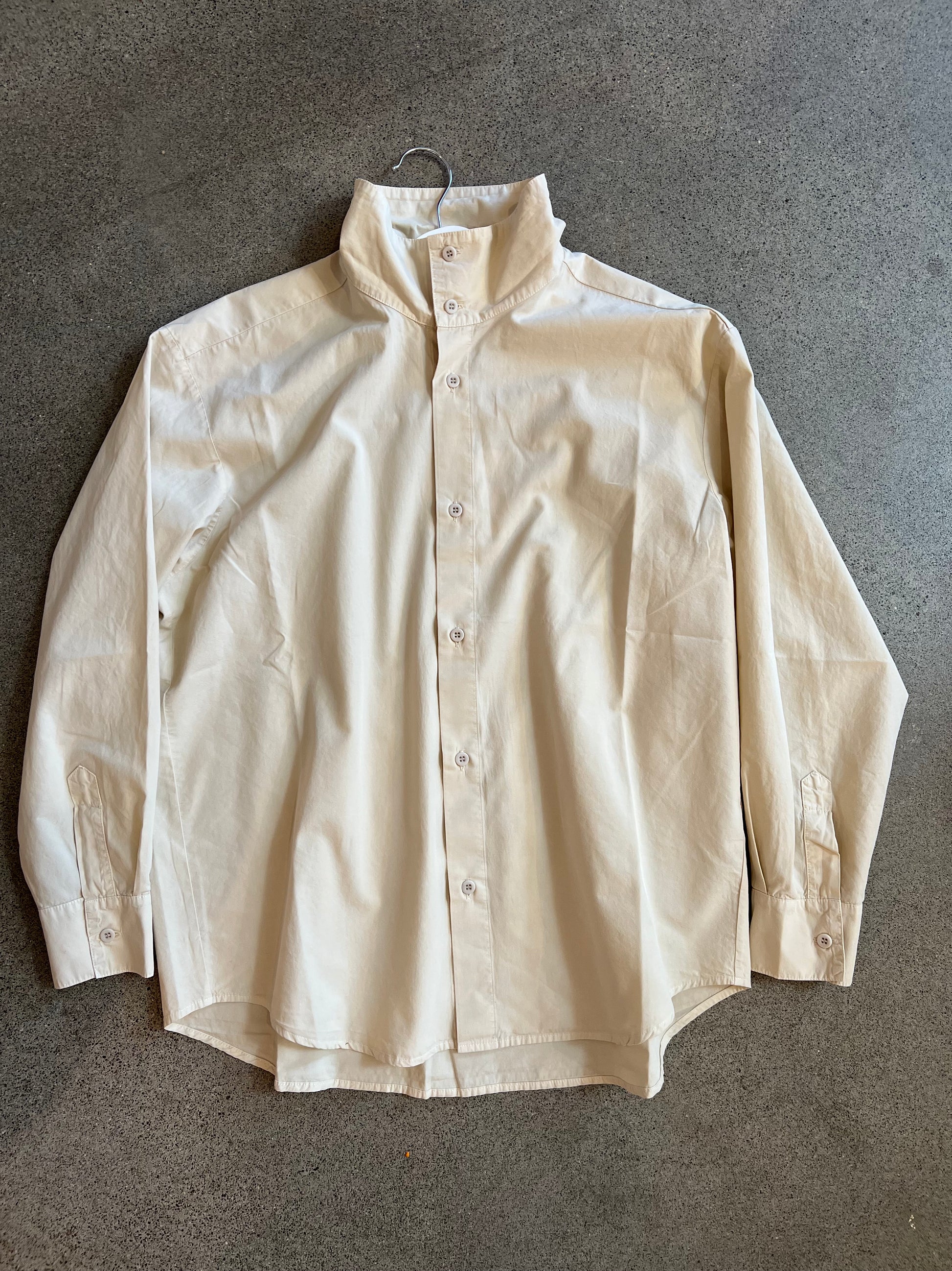 Simple cream-colored button shirt with a mock neck and rounded waist hem