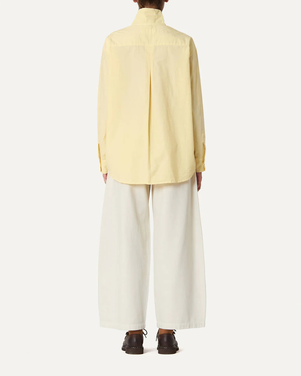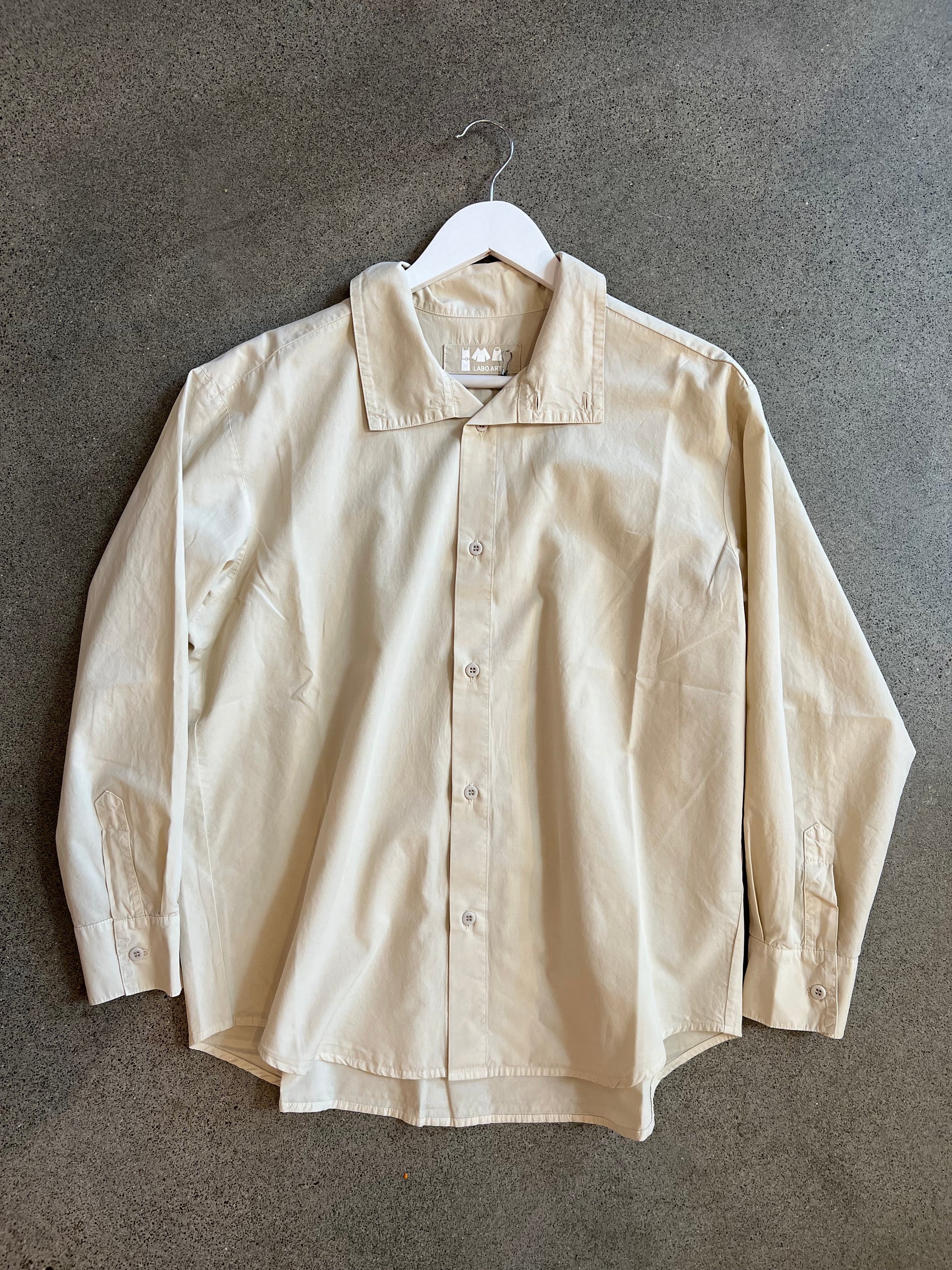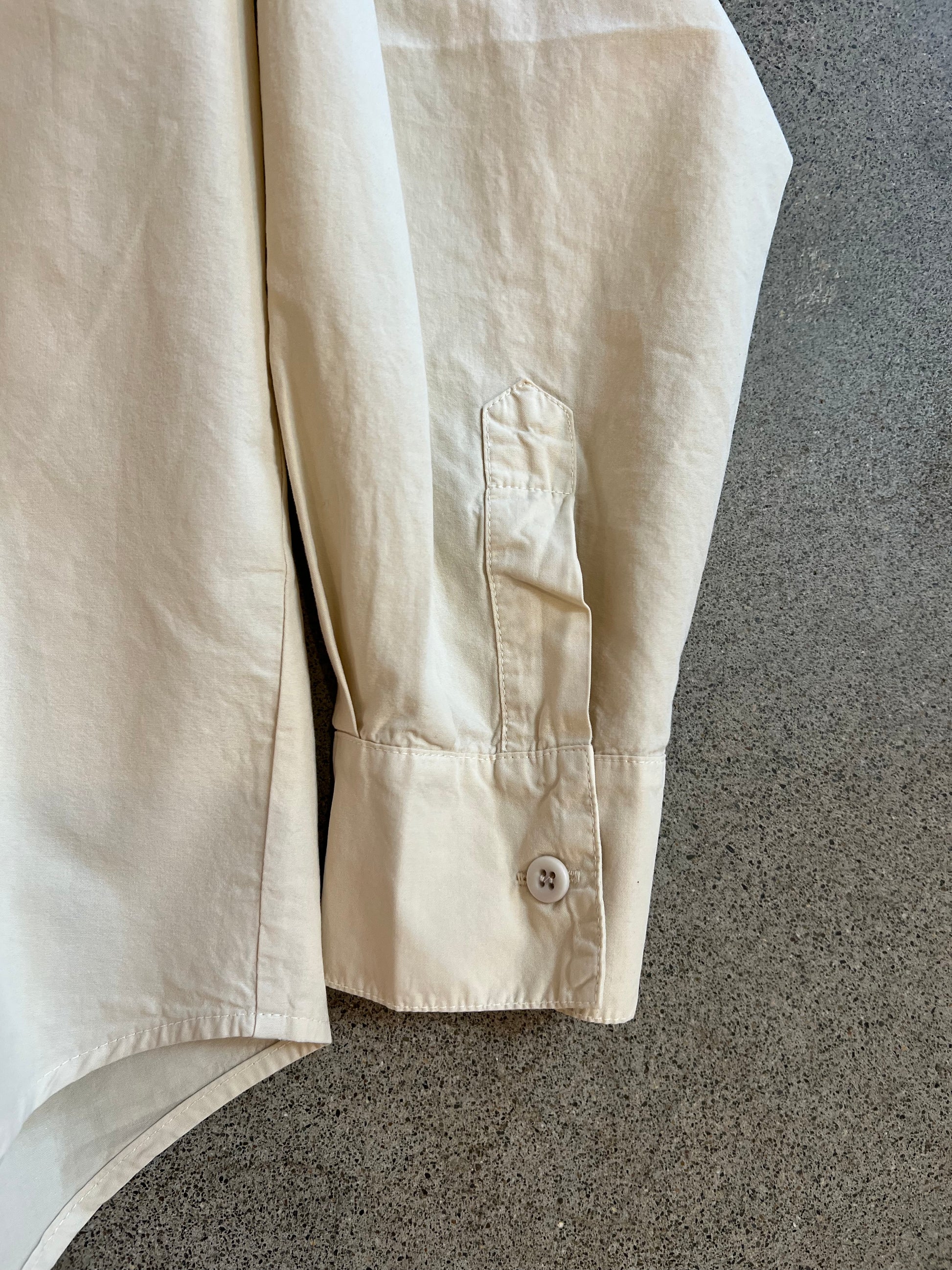 Simple cream-colored button shirt with a mock neck and rounded waist hem