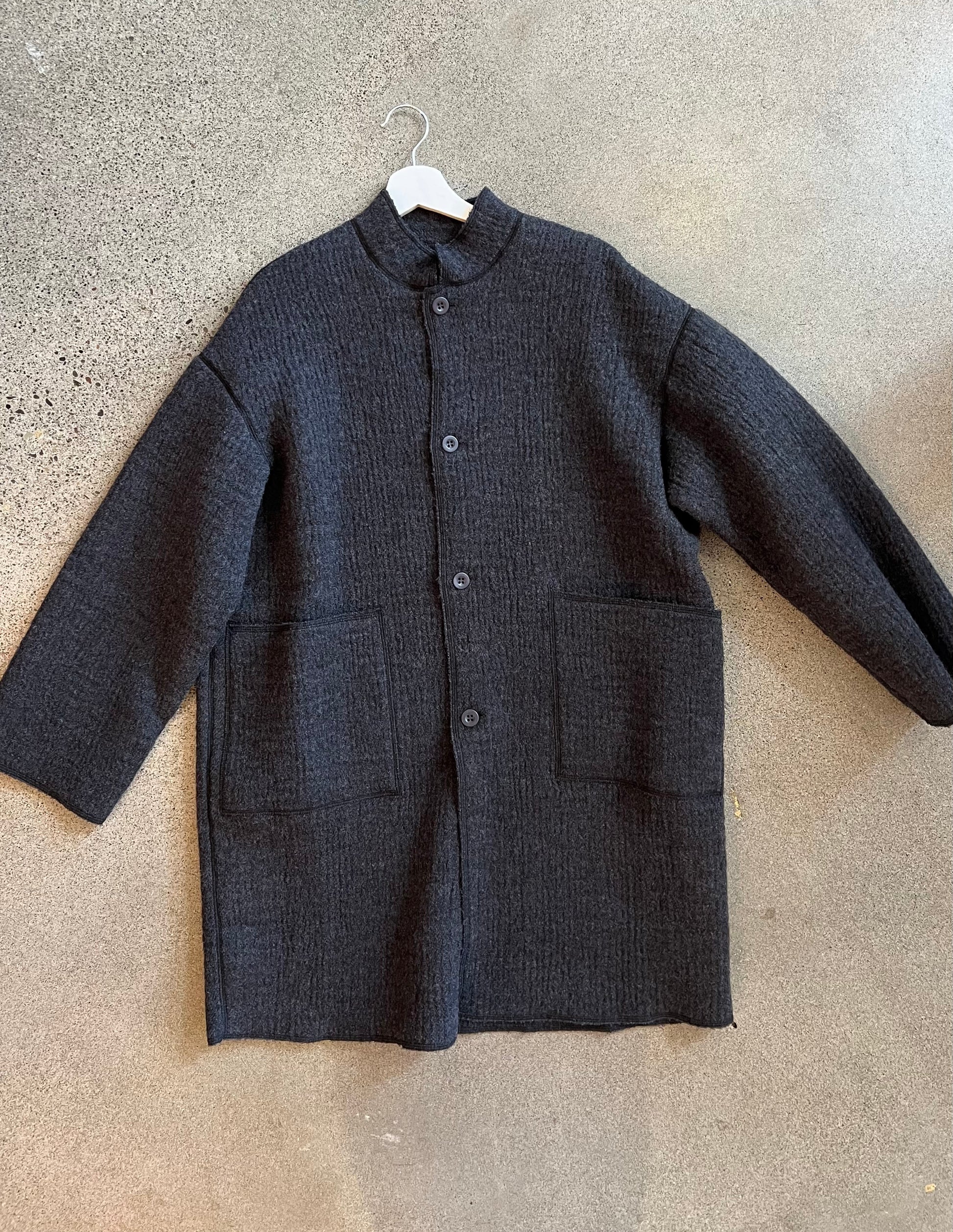 Long, structured wool jacket with a button closure and BIG patch pockets!