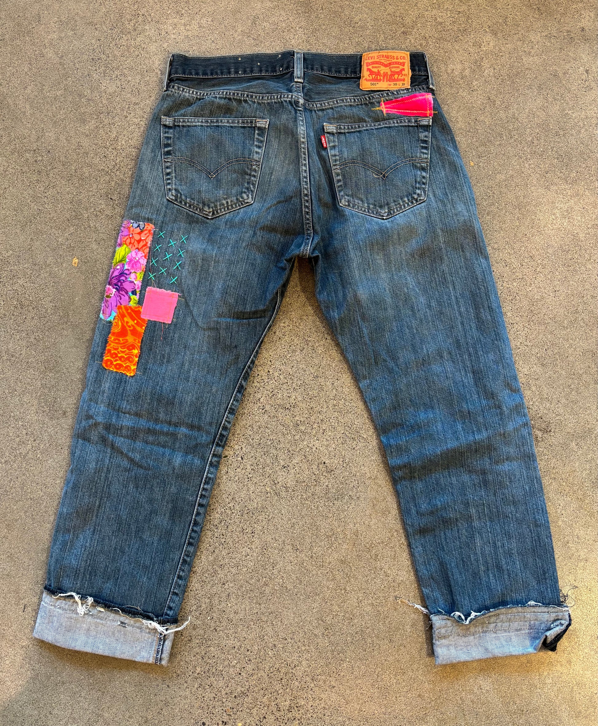 Vintage upcycled Levi's with embroidery, patches, and distressing