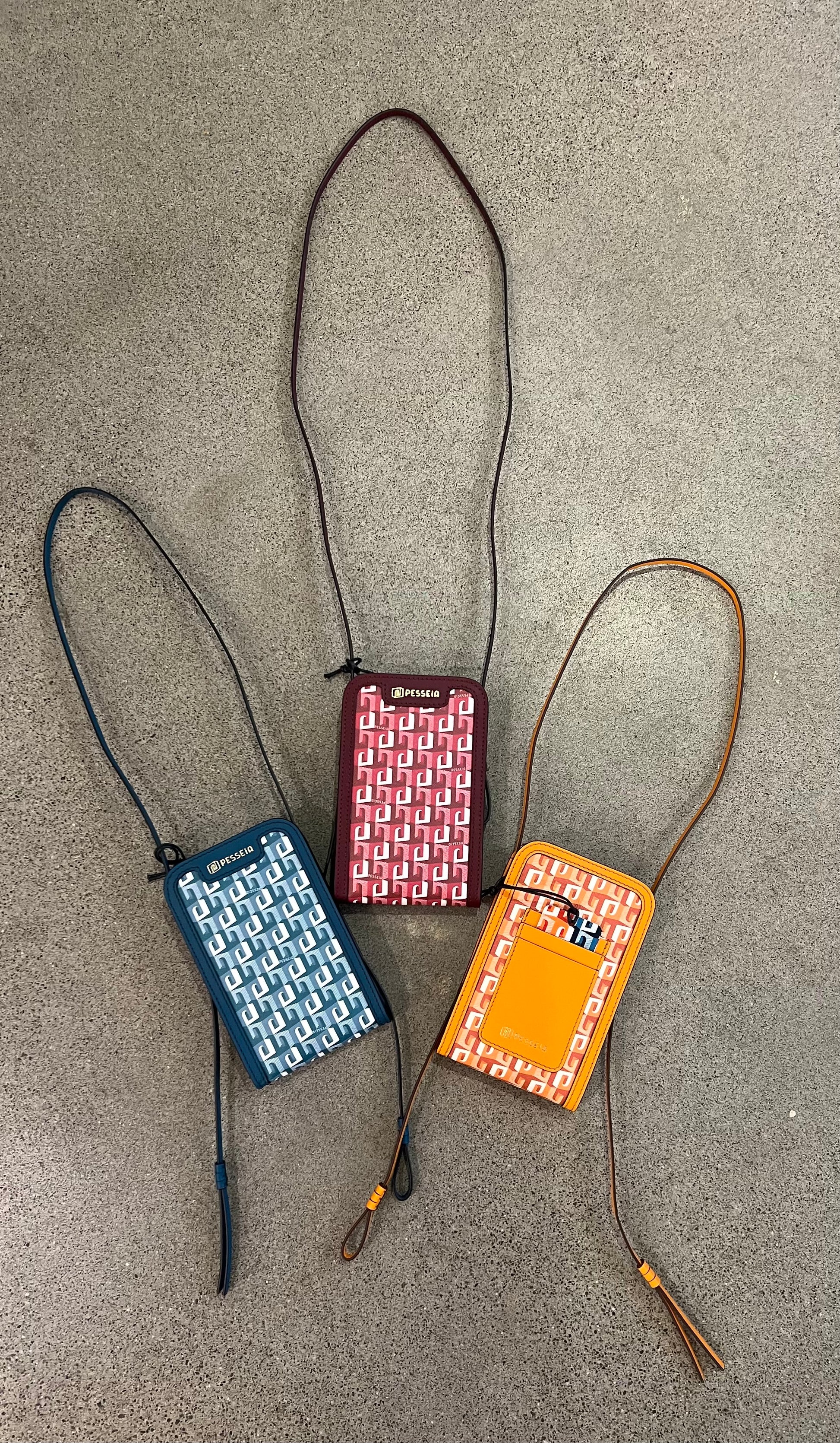 Leather strap measures 19.5" max clearance for cross body wearing with hand-tied knots that pull to adjust strap length