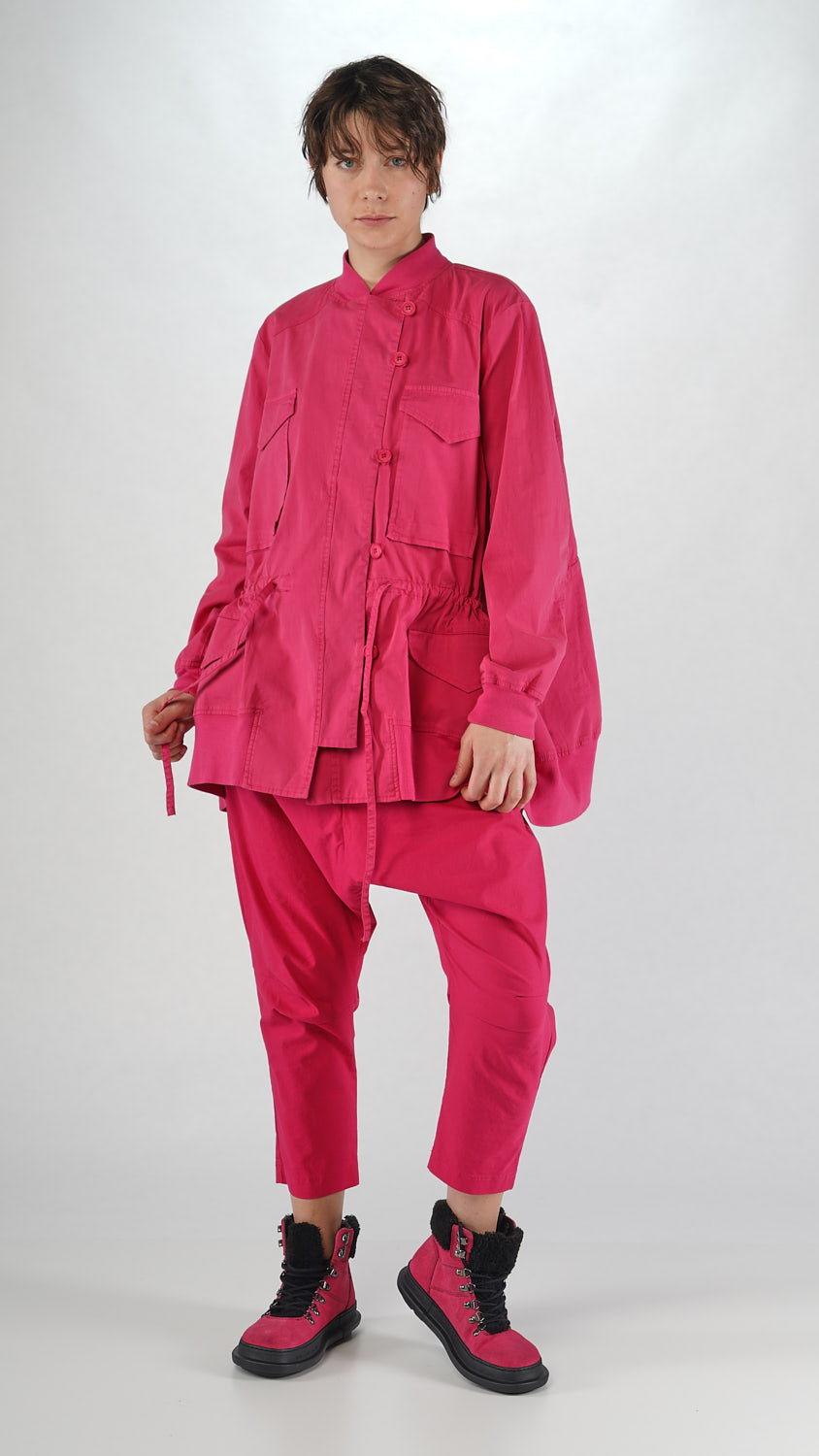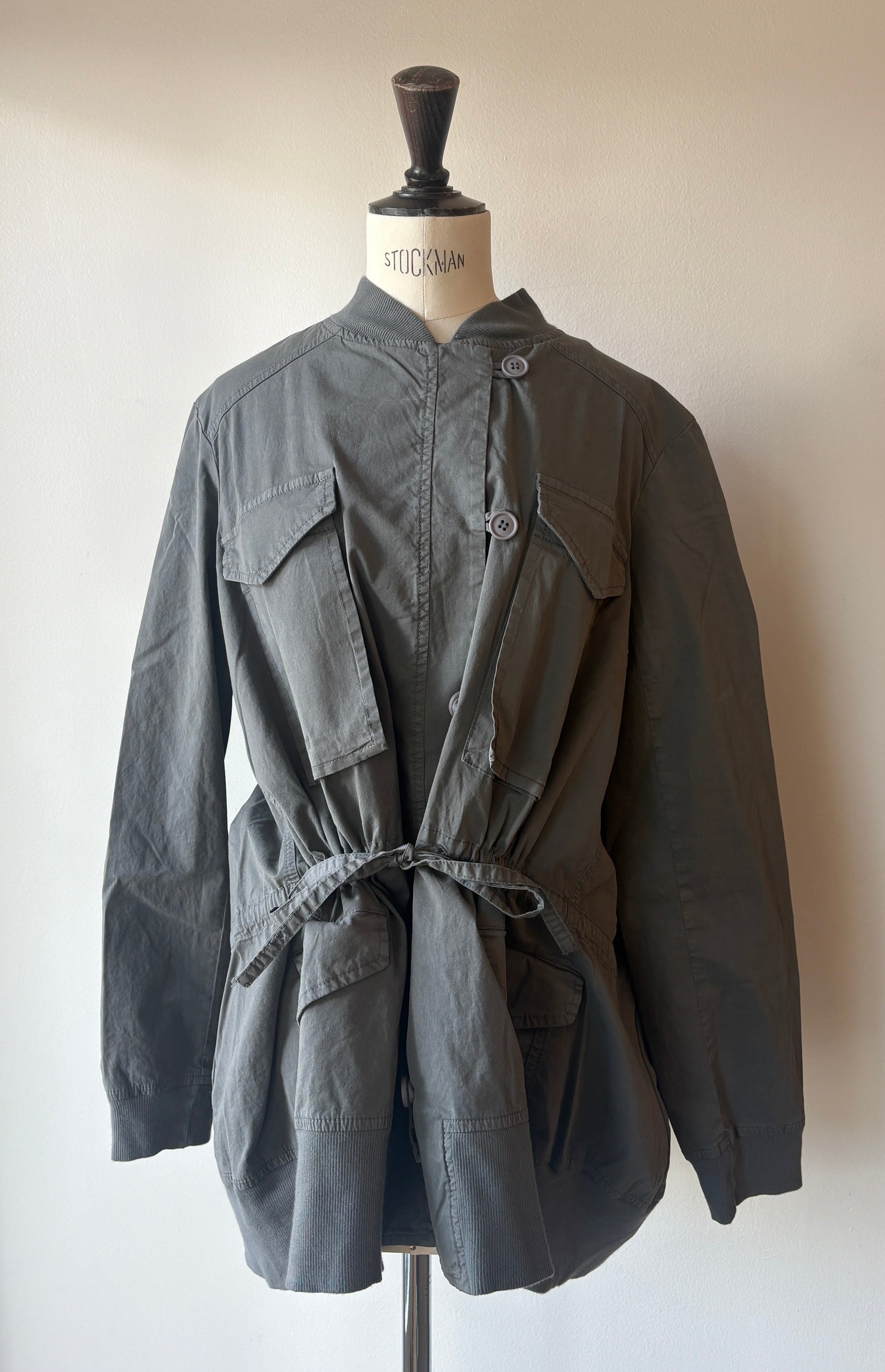Utility coat with many pockets, tiestrings and a visible loop button closure!