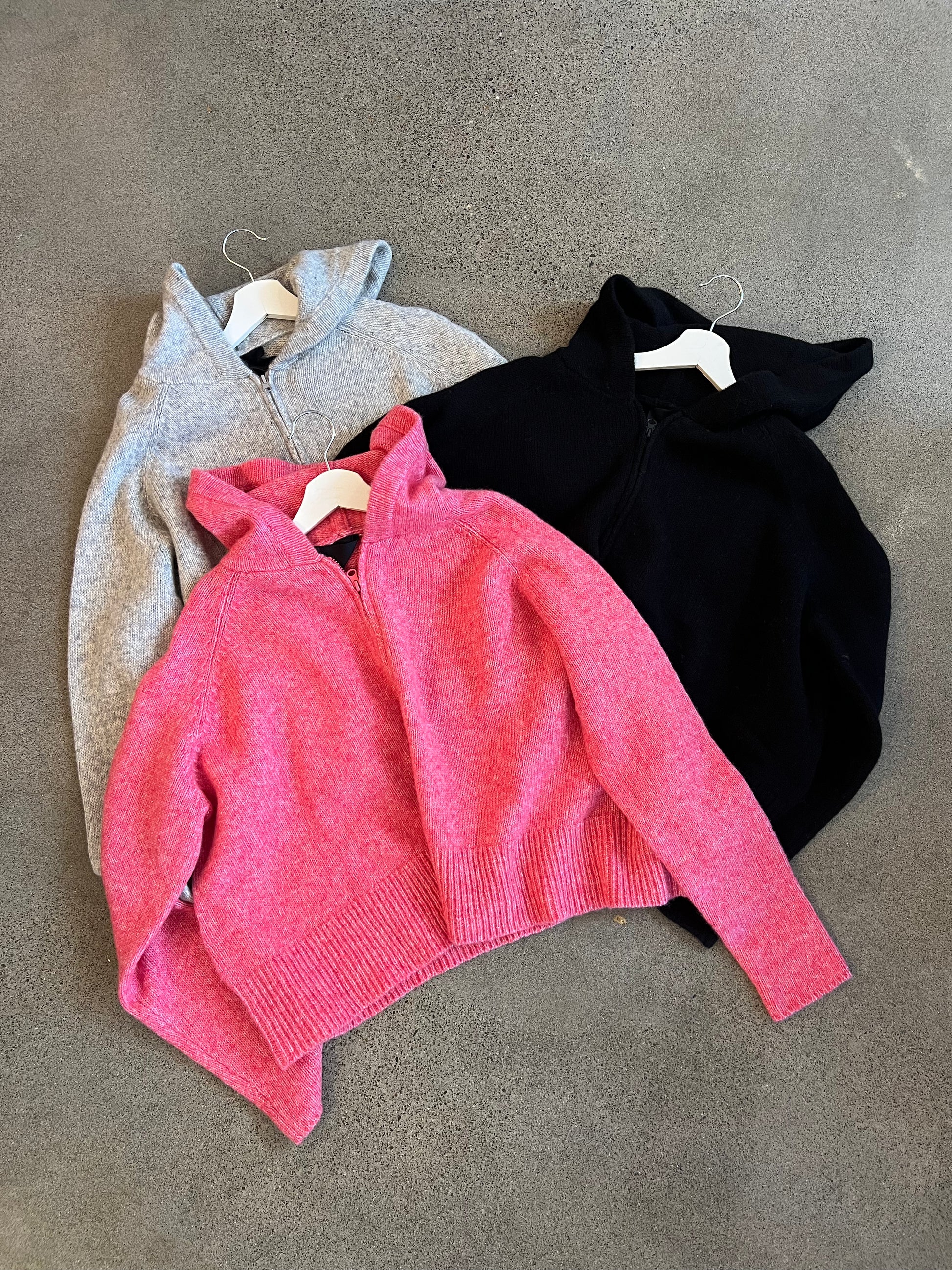 ** We had to have it in all three colors. The black one over a navy tee with your navy pleaseted skirt and tall riding boots. The grey goes over your pinstriped overalls to winter over your old fav and the pink... The pink is the pop of color you need on long grey days of February or next week if you live in the PNW.